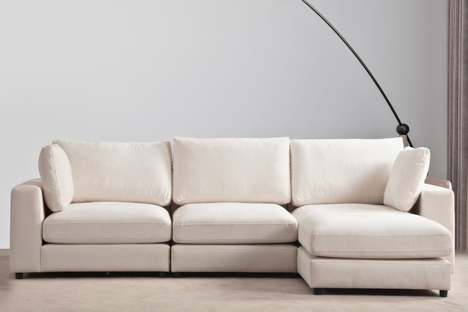Le canapé Julia modulable offre une ambiance harmonieuse grâce à son revêtement en velours blanc cassé et une sensation de douceur optimale avec sa mousse Ultra confort.