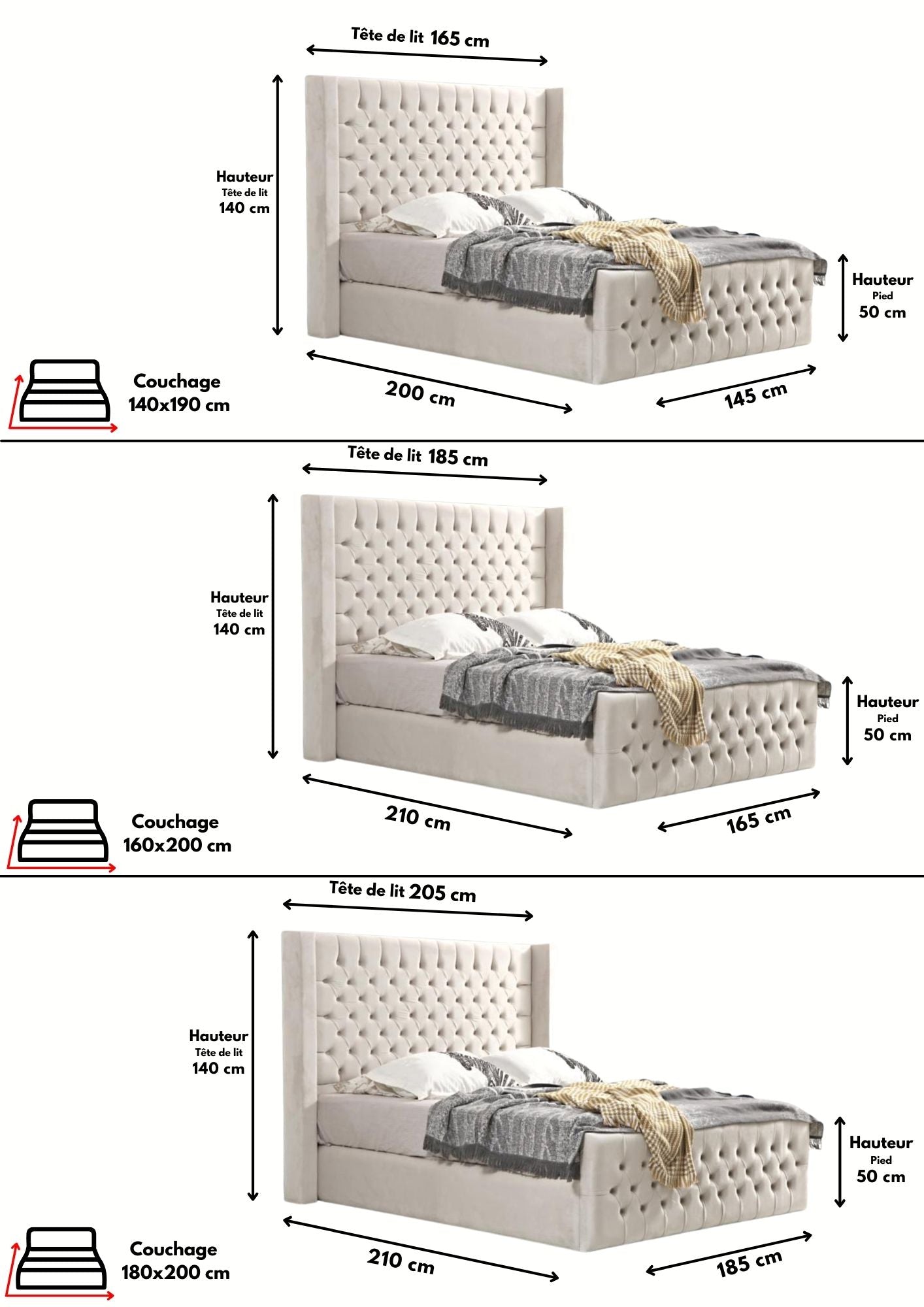 Découvrez le cadre de lit capitonné 2 places en velours. Le modèle Clouté apporte à votre chambre à coucher du prestige et du modernisme. Conçu avec du tissu en velours blanc d’excellente qualité, votre cadre de lit capitonné s’harmonise facilement avec tout type d’intérieur. Sa structure métallique robuste vous permet de l’utiliser durant plusieurs années sans encombre. Votre cadre de lit 2 places est disponible en 3 dimensions : 140x190 160x200 et 180x200. Profitez d’une agréable et charmante nuit grâce à votre cadre de lit en velours. Vendu avec ou sans sommier, selon votre choix.