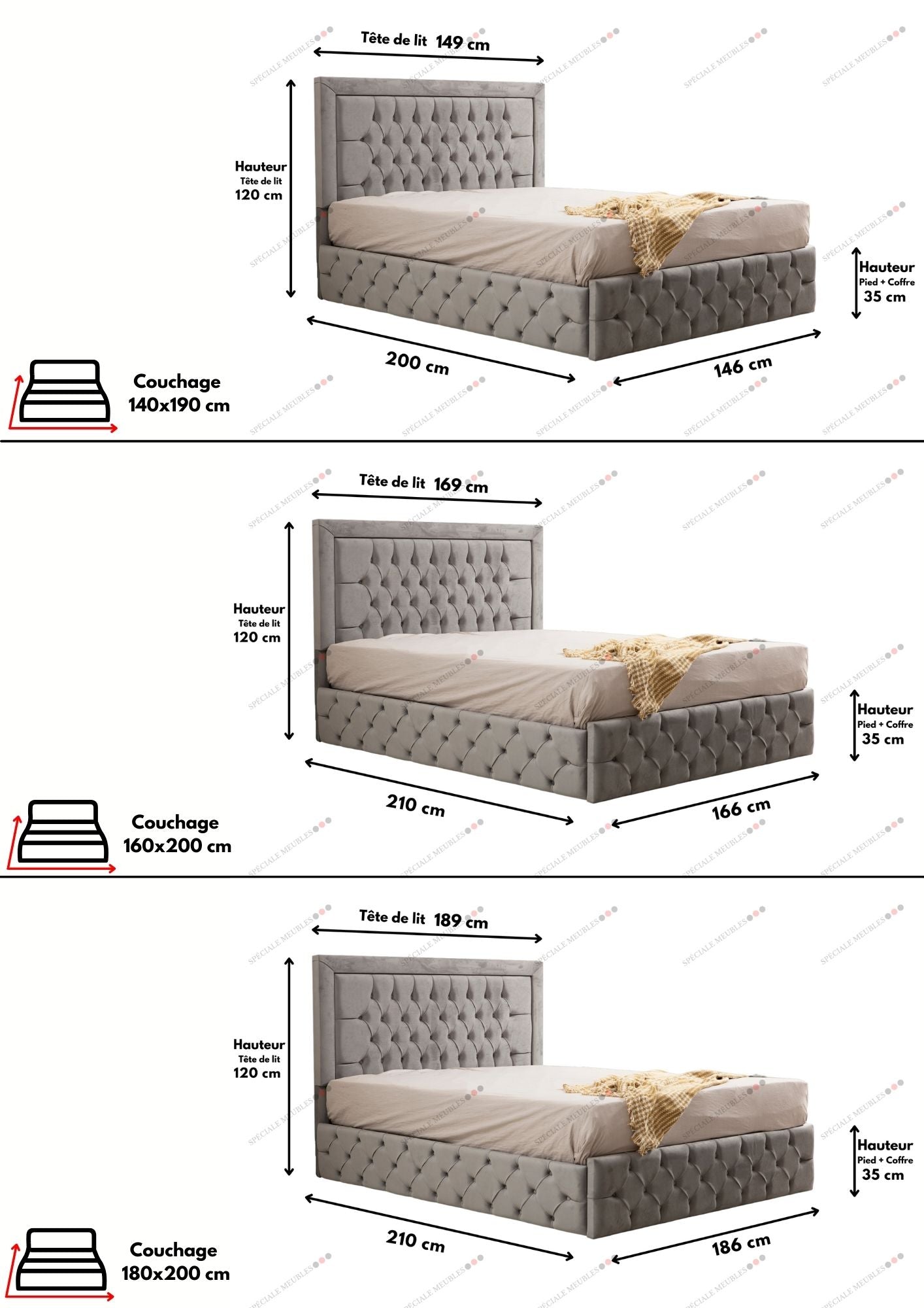 Meublez votre chambre à coucher avec le cadre de lit capitonné 2 places Roma. Conçu avec du velours gris, votre cadre de lit capitonné s’intègre parfaitement dans tout type d’intérieur. Ses trois dimensions 140x190 160x200 et 180x200 vous garantissent l’espace suffisant pour passer une douce et agréable nuit. Selon votre choix, votre cadre de lit peut être fourni avec ou sans sommier. Quant à sa structure métallique robuste, elle lui assure une très grande longévité. Avec votre cadre de lit capitonné 2 places, votre intérieur s’orne d’une allure digne et royale.