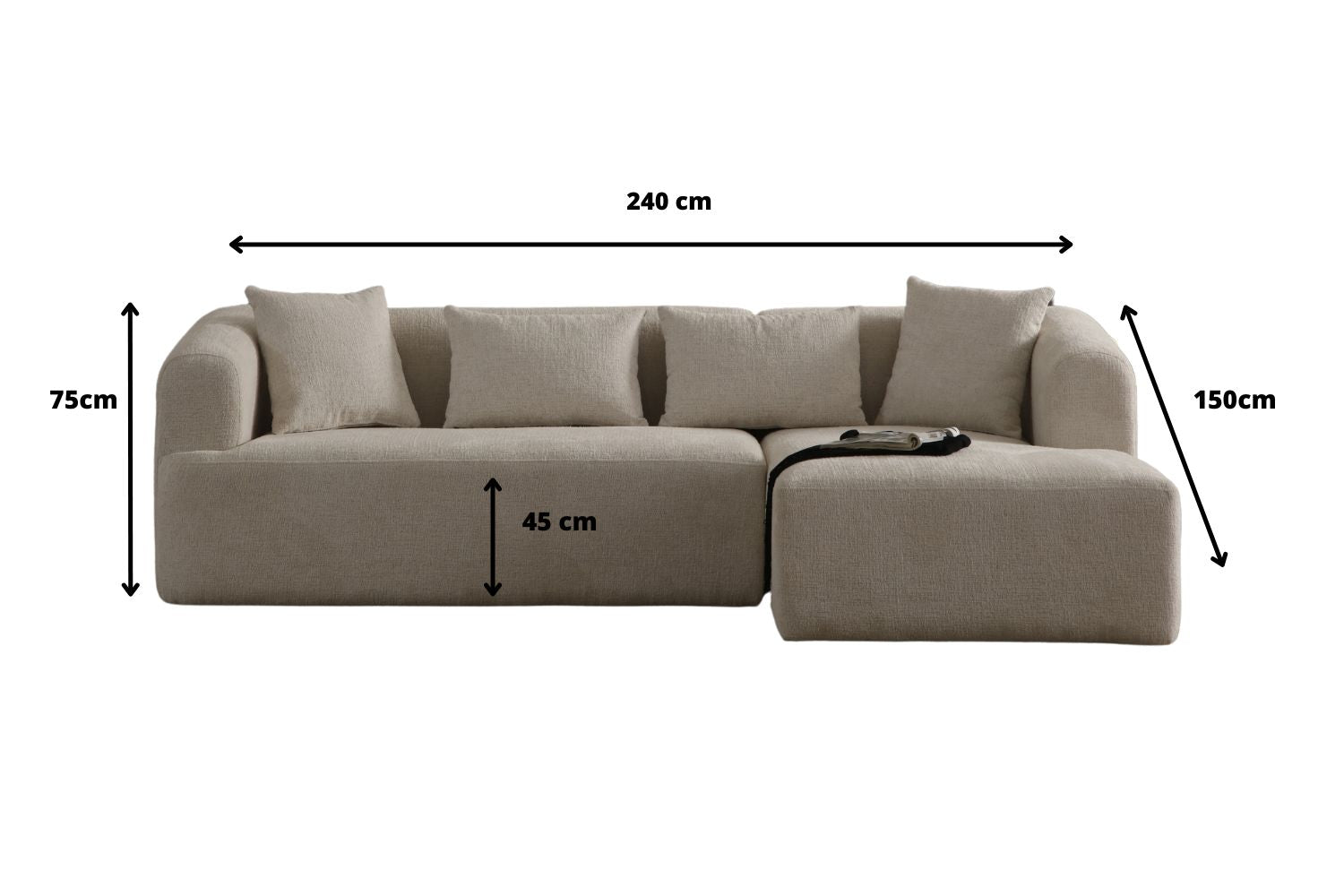 Avec ses 240 cm de largeur et sa méridienne de 150 cm, le canapé Ela est idéal pour les salons de taille moyenne. Il optimise l’espace tout en offrant une assise généreuse et conviviale pour accueillir votre famille et vos amis.